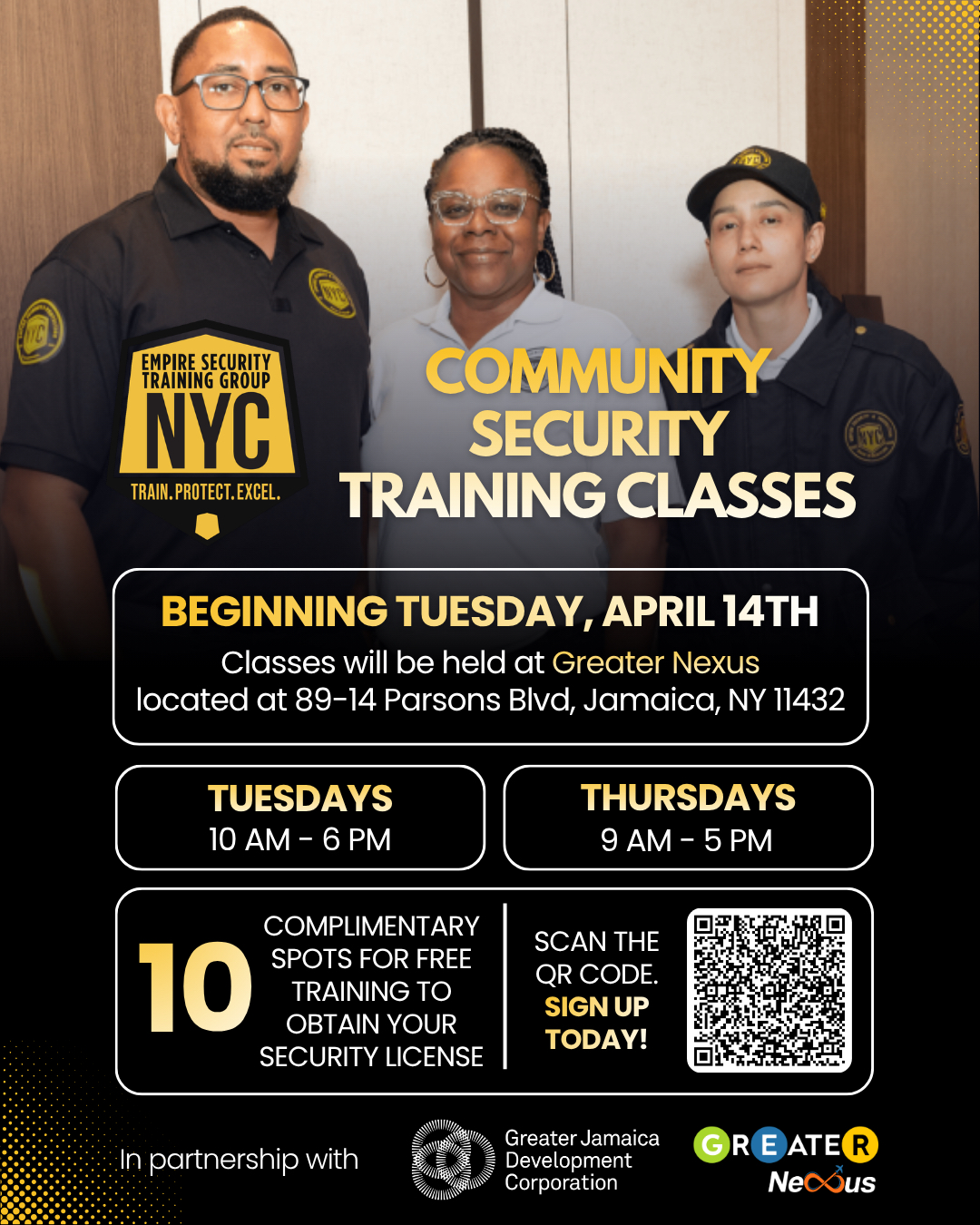 Ready to kickstart your career in security? This is your chance! Starting April 14th 2026, Empire Security Training Group NYC will be leading Community Security Training Classes at Greater Nexus for anyone ready to earn their security license.